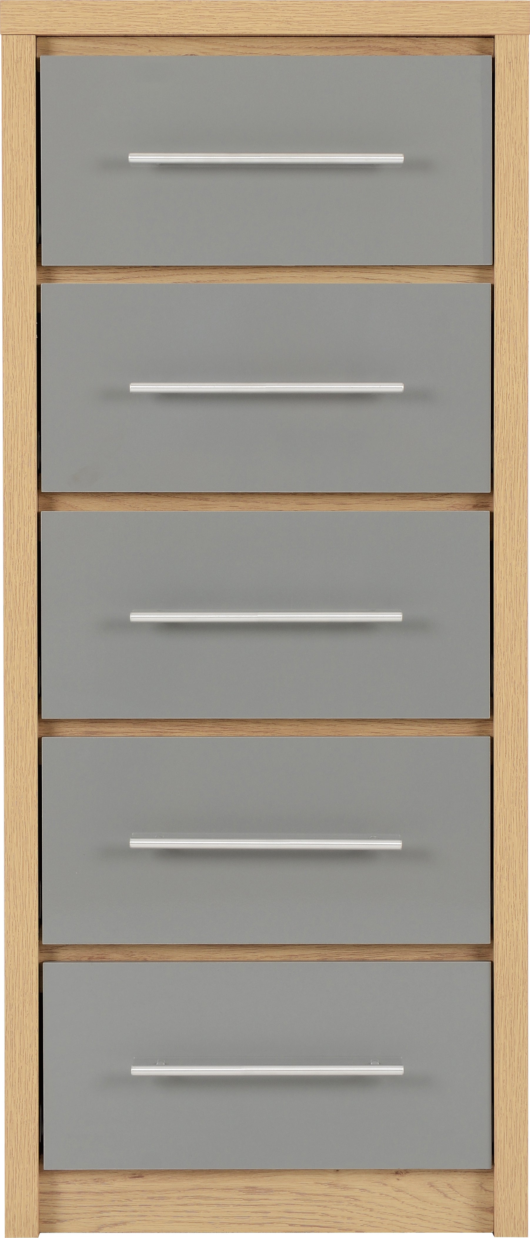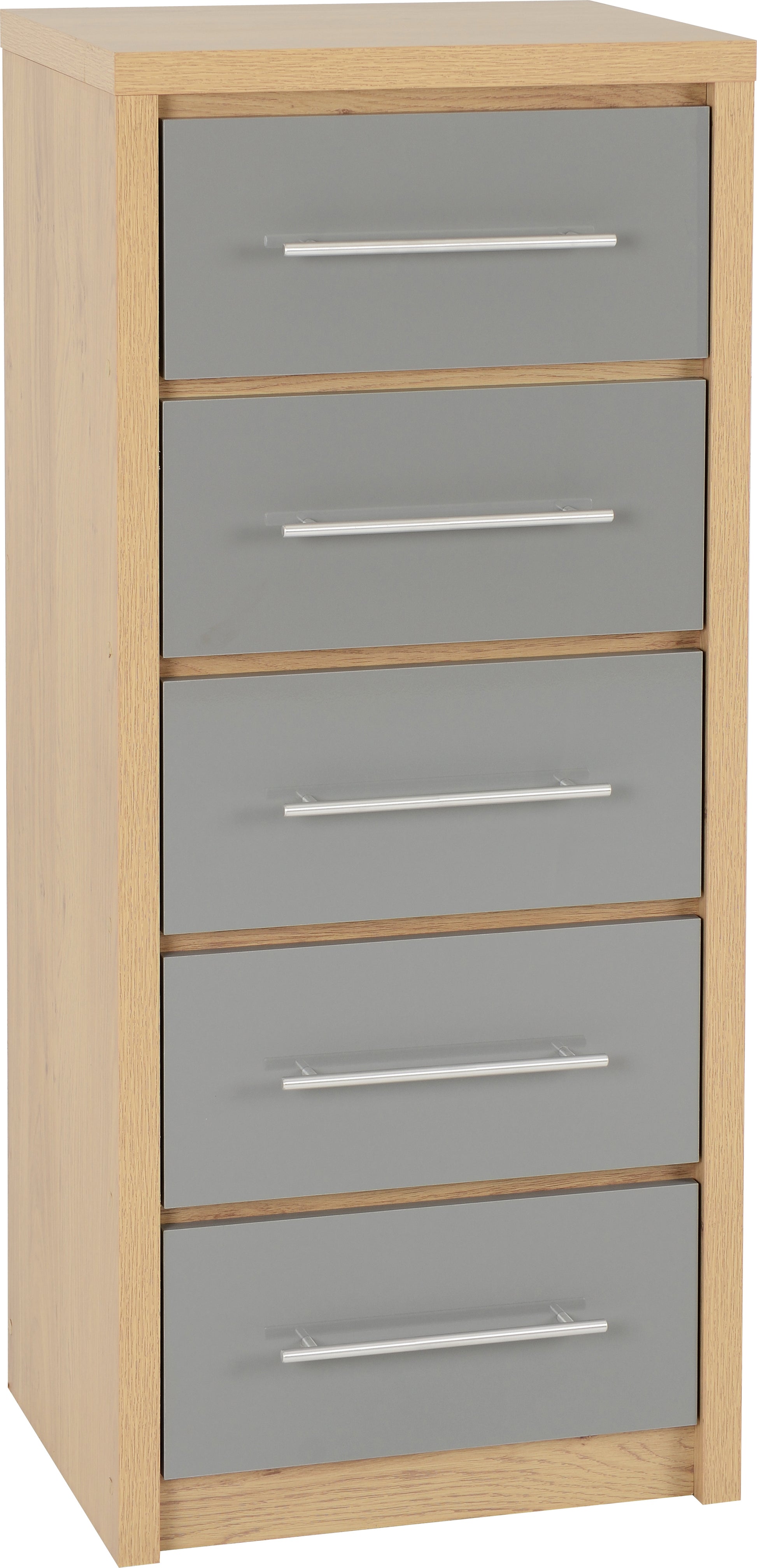 SEVILLE 5 DRAWER NARROW CHEST - GREY HIGH GLOSS/LIGHT OAK EFFECT VENEER